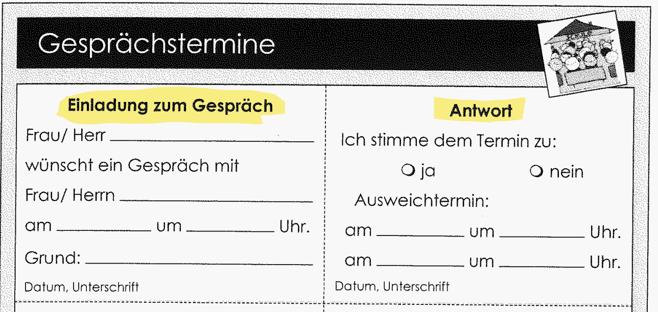 Besteht bei einer Lehrkraft ein Gesprächsbedürfnis, so erfolgt die Mitteilung ebenfalls über den Schulplaner Ihres Kindes unter der Rubrik „Gesprächstermine“ (Im letzten Teil des Schulplaners zu finden.). Bitte melden Sie zügig Ihre Antwort über das „Antwort“-Feld zurück.